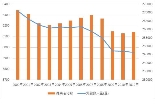 左軸:従業者総数(人) 右軸:労働投入量(週)(万時間)