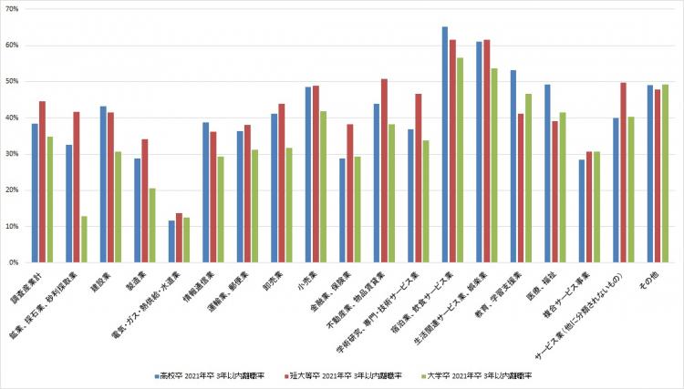 業種別の早期離職率(ここでは3年以内離職率)は学歴横断的に以下の傾向がある。