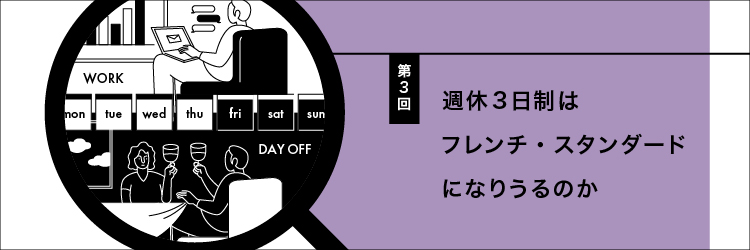 フランスでは、週休3⽇制は「ニューノーマル」時代の働くリズムを緩和し、ワーク・ライフ・バランスの両⽴を改善し、労働市場全体の底上げに貢献することが可能とされている。こうした観点から、週休3⽇制が現在の週休2⽇制に取って代わる⽇も近いと考える人が増えた。