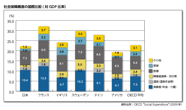 引退世代のための社会保障と現役世代のための社会保障については、現役世代向けが充実していて、引退世代向けはむしろドイツやフランスより少ないことが特徴である。