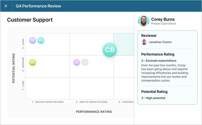具体的には、レビューサイクルで収集された評価結果を基に、複数のマネジャーや人事担当者がオンライン上の「評価マトリクス(Box View)」に従業員を配置しながら議論を進める。たとえば、「成果×ポテンシャル」といった評価軸に基づき従業員を9マスのマトリクスに分類することで、評価の偏りや昇進候補の妥当性を視覚的に確認し、評価コメントや昇進・推薦に関する記述、過去のフィードバック履歴などを基に、従業員を多面的に評価することができる。