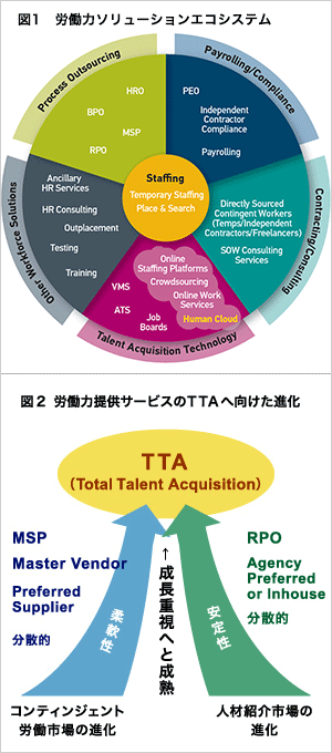 人材関連サービスには大きく分けて「無期雇用を前提としたもの」と「一時的労働力に関するもの」の2種類ある。どちらの領域も、以前は顧客企業1社に対してあらゆる業者が分散的にサービスを提供していたが、顧客企業は特定の業者のみを優先して利用し始め(Preferred Supplier/Agency)、次第にMSPやRPO(※3)に採用や管理を一手に任せるようになった。時代はトータルタレントマネジメント(TTM)へと移り変わってきている。TTMとは、顧客企業に従事している労働力を総合的に管理する人材管理モデル。正社員と臨時労働者のソーシング、採用、管理を一手に引き受ける(図2)。トータルタレントアクイジション(TTA)ともいう。