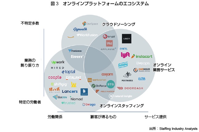図3はオンラインプラットフォームのサービスをSIAがまとめたものである。エーシン氏は「従来のスタッフィング会社とオンラインマーケットプレイスが互いに合流し、ハイブリッドなサービスを提供するようになる」と予想する。図4にあるように、買収や新サービスの提供によって既にそれが発生している。