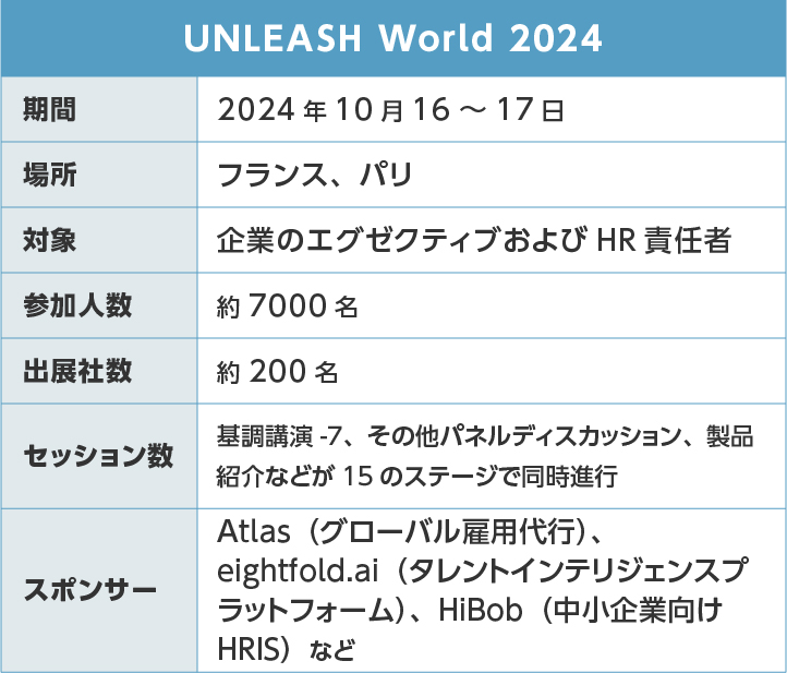 2024年10月16日と17日に、フランスのパリでUNLEASH World 2024 が開催された。UNLEASHは欧州を拠点とするHRテクノロジーのコンファレンスで、年2回、欧州と米国で行われている。今年の展示会にはスタートアップから大手まで約200社のHRテクノロジーベンダーが出展し、特に給与計算分野のベンダーが目立った。これは、企業が公正な給与制度の確立を目指していることが背景にあると考えられる。今回で13年目を迎えたUNLEASH World 2024では、15のステージで同時にセッションが行われ、250人の講演者が登壇した。特に注目を集めたのは、未来予測の専門家Amy Webb氏とHR領域のアナリストJosh Bersin氏による基調講演である。彼らは、それぞれの視点からHRテクノロジーの進化がもたらす可能性と課題について語り、組織が未来に向けてどのように備えるべきかを共有した。