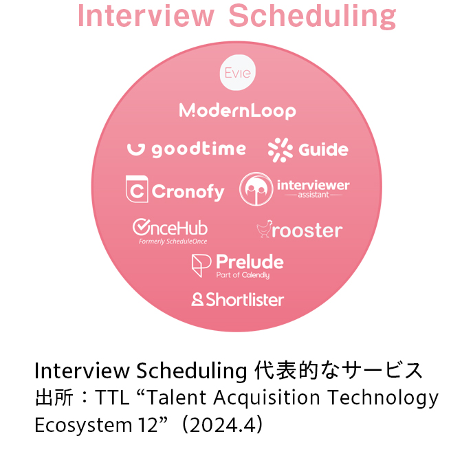 - 面接のスケジューリングを行う。面接担当者の空き時間やタイムゾーンを基に候補日時を抽出し、求職者に提示する。日時が確定した後、求職者にメールやショートメール(SMS)で招待URLを自動送信する。(Rooster)