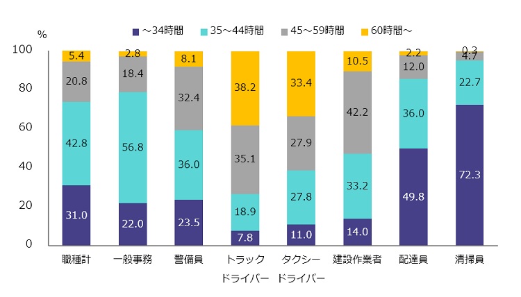 特に長時間労働が常態化しているのは、トラックドライバー(平均週労働時間:52.4時間)やタクシードライバー(同:50.0時間)である。全職種の平均労働時間は36.0時間であるため、それよりも4割前後も長いことになる。警備員(同:40.7時間)や建設作業者(同:43.9時間)もこれらの職種と同様に労働時間が長い傾向がある。