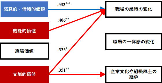 また、第2段階と第4段階では「感覚的・情緒的価値」の機会があるほど、仕事への満足感を高めていた。つまり、ひとり立ちして周囲の人から評価される段階までの人は情緒的な側面を共有する機会があるほど、仕事への満足感が高められていた。熟達者となる第5段階では「文脈的価値」が仕事への充実感を高めていた。つまり、熟達者は、仕事での意見を共有する機会のみが仕事への充実感を高めている。