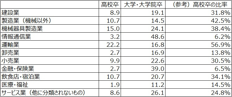 また、比率についても業種によって非常に大きな開きがあることがわかる。運輸業のように高校卒の比率が50%を超え(56.9%)、大学・大学院卒よりも採用予定数が多い業種が存在している。その一方で、情報通信業(6.2%)、金融・保険業(6.5%)のように高校卒が著しく少ない業種もある。