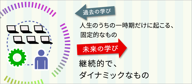 これまでは、人生の決まった時期に学校で学び、その後、社会に出て働くというのが、世界中で当たり前のことでした。しかし、物事が急速に変化する世の中では、人々にとって学ぶことは必然であり、過去に学んだ内容を捨てたり、新たに学び直したり、方向を変えたりしていく必要があると思います。"教育"であれ"学習"であれ、呼び方はどうあれ、人々が学び続けることが必要になるのです。"教育"という言葉は、"学び"よりもフォーマルなものとして使われる傾向がありますが、"学び"というと、もっと豊かなプロセスを指すように思います。私は、人々がこれから残りの人生のなかで、豊かな学びのプロセスを享受していくようになると考えています。