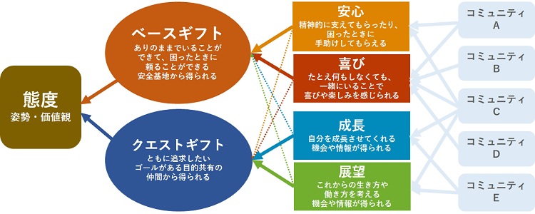 ここからは、コミュニティと本人の意識や行動、経験との関係を見ていこう。コミュニティのベース性、クエスト性には一定の傾向があるが、すべての構成員か同等のギフトを獲得するというわけではない。参加者がその場にどのような姿勢で臨んだのか、どのような役割を果たしたのか、そしてどのような経験をしたのかによって、得られるギフトは変わるはずだ。