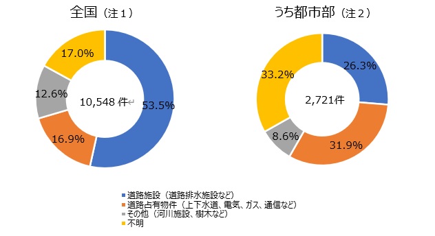 2022年度において、道路の陥没は10,548件発生し、そのうち地中に埋設された上下水道やガス、通信などの道路占有物件が要因とされる陥没は全国で16.9%(1,787件)を占めていた。これを都市部に限ってみると、実に31.9%(869件)が道路占有物件による陥没となっている(図表1)。地中の埋設物が要因となる道路陥没は、決して他人事ではない。