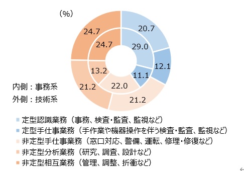 (※1)①定型認識業務は、あらかじめ定められた基準の正確な達成が求められる事務的業務であり、事務、検査・監査、監視などが当てはまる。②定型手仕事業務は、あらかじめ定められた基準の正確な達成が求められる身体的業務であり、手作業や機器操作を伴う検査・監査、監視などが当てはまる。③非定型手仕事業務は、状況に応じて個別に柔軟な対応が求められる身体的業務であり、窓口対応、警備、運転、修理・修復などが当てはまる。④非定型分析業務は、抽象的な課題を解決する業務であり、研究、調査、設計などが当てはまる。⑤非定型相互業務は、対人コミュニケーションを通じて価値を提供する業務であり、管理、調整、折衝などがあてはまる。調査では「あなたが現在担当している業務において、過去1年間の以下の業務はどのくらいの比率でしたか。合計が100になるようにお答えください」と質問し、①から⑤の各タスクについて、説明と例を示した選択肢を用意して、それぞれの業務比率について回答を得ている。