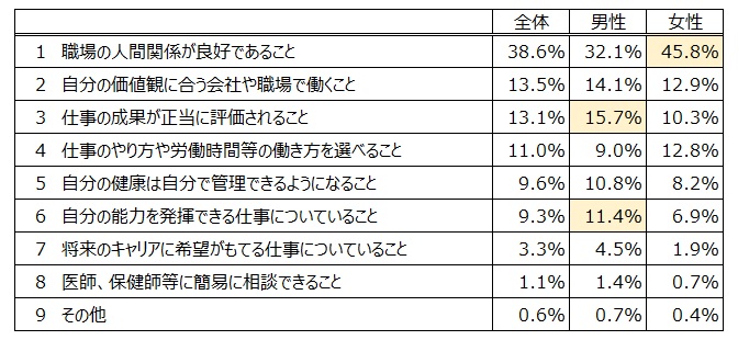 全体と男女別の結果を示したものが表1であるが、全体でも、男女別でも、健康で働くために最も重要なのは、「職場の人間関係が良好であること」とする回答が圧倒的に多い結果となっている。特に女性の回答割合は45.8%となっており、全体38.6%、男性32.1%に比べ、高い数値となっている。