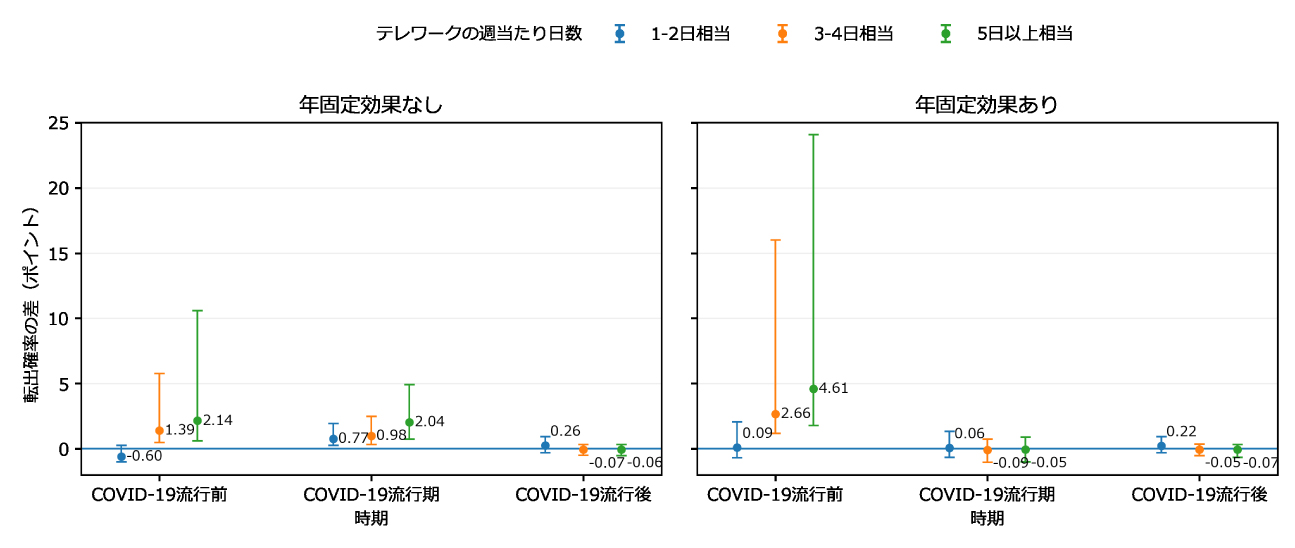 COVID-19流行前は、年ごとの共通変化(年固定効果)を考えない場合も考える場合も、傾向は同じだった。テレワークが週1~2日相当の人では、転出とのはっきりした関係はみられなかった。これに対し、週3~4日相当の人は、テレワークをしない人より転出の確率が2.66ポイント高く、週5日以上相当の人では4.61ポイント高かった。少なくとも流行前のデータでは、「少しだけテレワーク」をしている人よりも、「高い頻度でテレワーク」をしている人で転出との関係がみえた。