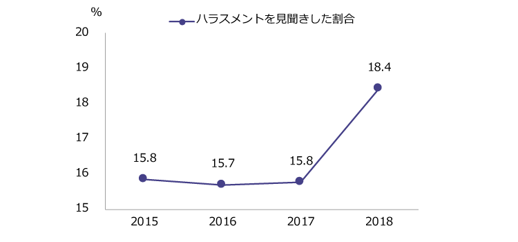 リクルートワークス研究所「全国就業実態パネル調査(JPSED)」において、ハラスメントを見聞きした経験の有無の推移をとると、2018年のハラスメントを見聞きした人の割合は18.4%と前年から急速に上昇した(図1)。これはハラスメント行為自体が増えているというよりも、近年のハラスメントを巡る世の中の感度の高まりが影響しているものと考えられる。
